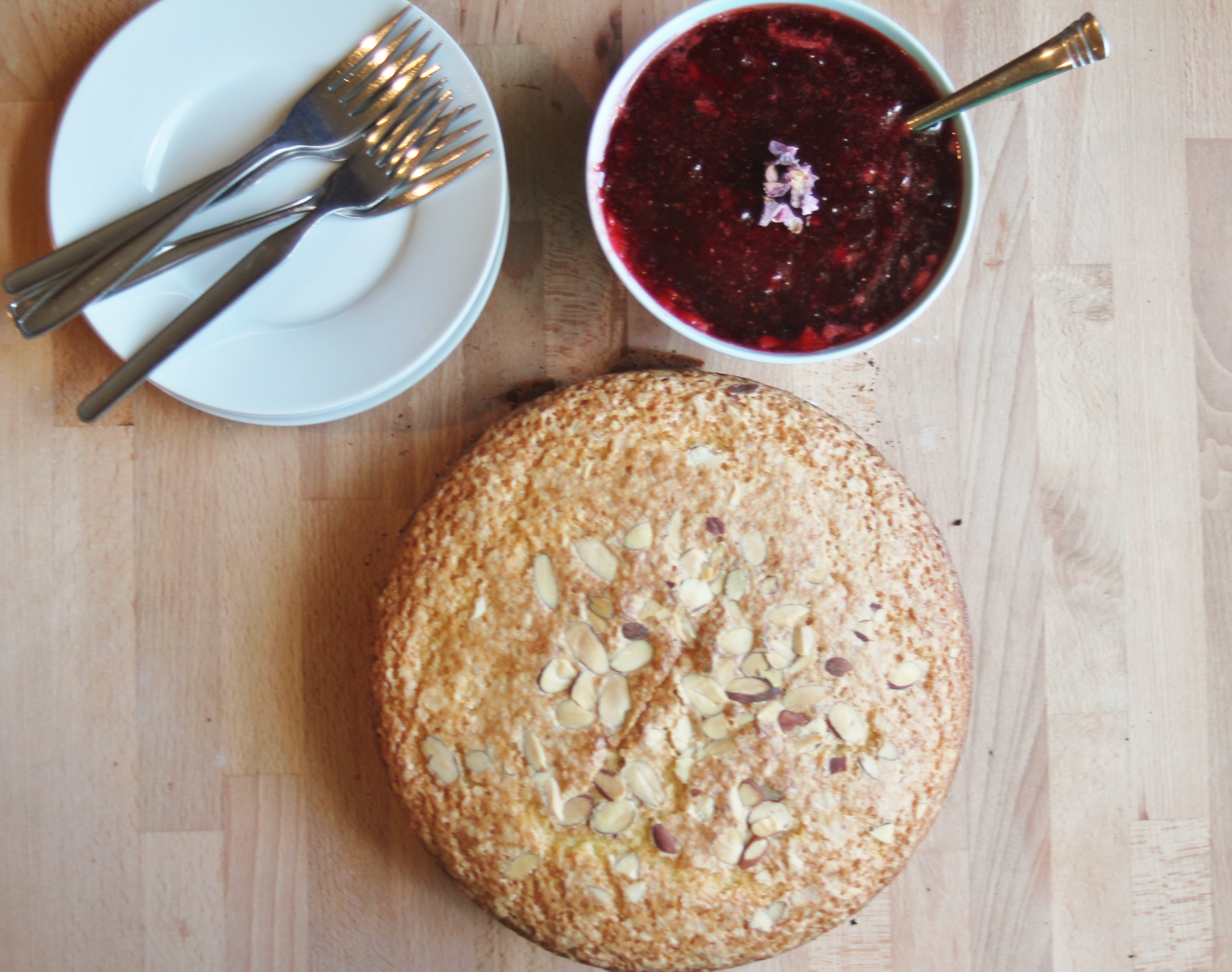 In this recipe, I used Rio Orange Olive Oil to make a delicate, floral Citrus Olive Oil Cake; I added some sliced almonds to the top for some smoky crunch and texture. To pair, I threw some strawberries into a small saucepan with a 1/3 cup of Spaulding’s Lovely Rose Sugar and a tablespoon of cornstarch. Depending on the sweetness of your berries, you may need to add additional sugar, 1 T. at a time. This compote is nearly impossible to mess up, but the key is to add additional sugar and/or cornstarch a little at a time.