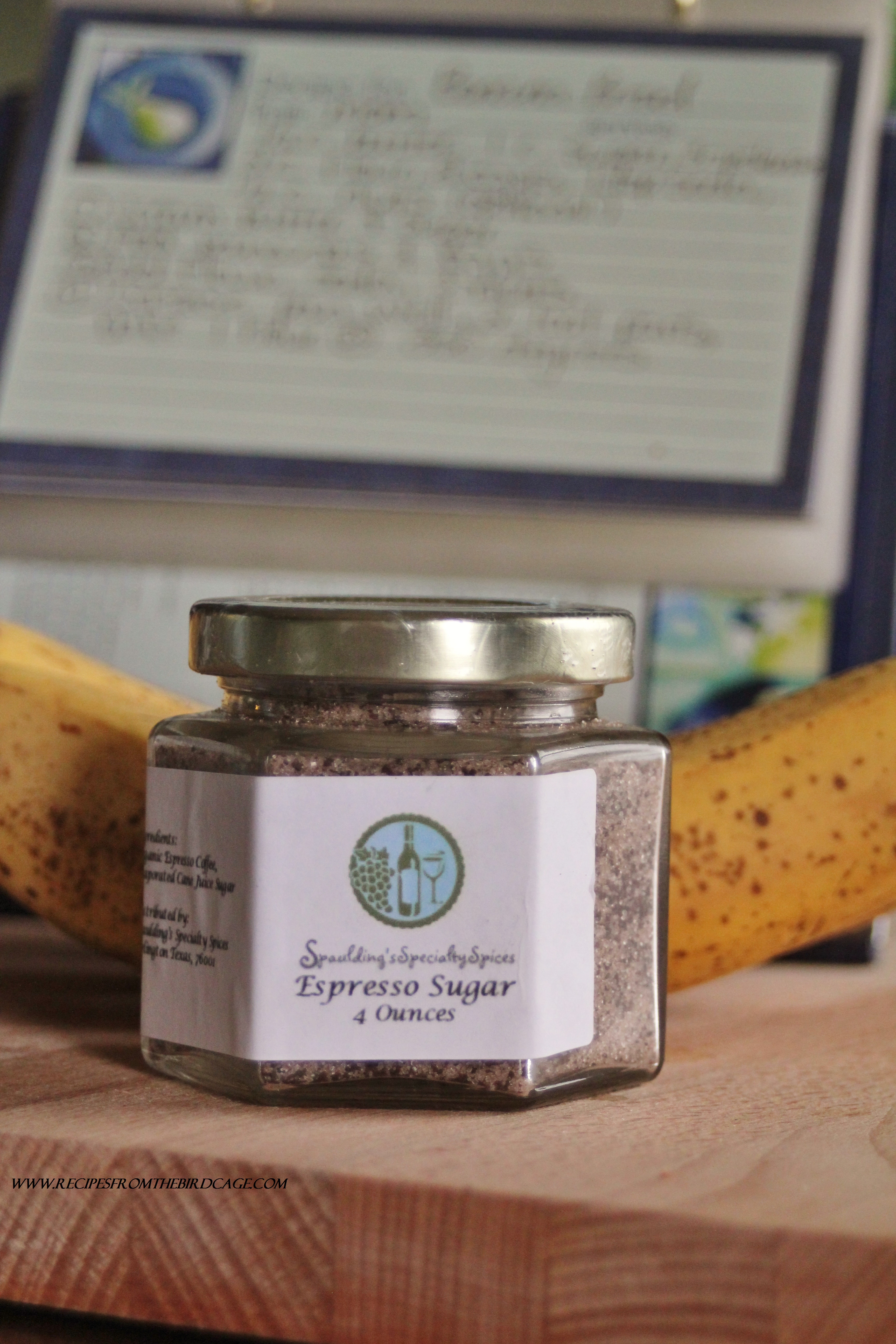 Suddenly facing a severe surplus of spotty bananas, I decided to whip out Mom’s recipe. However, I decided to give it a bit of gussying up with some Espresso Sugar I had in the cupboard made by Spaulding’s Specialty Spices. Check them out on Facebook here.