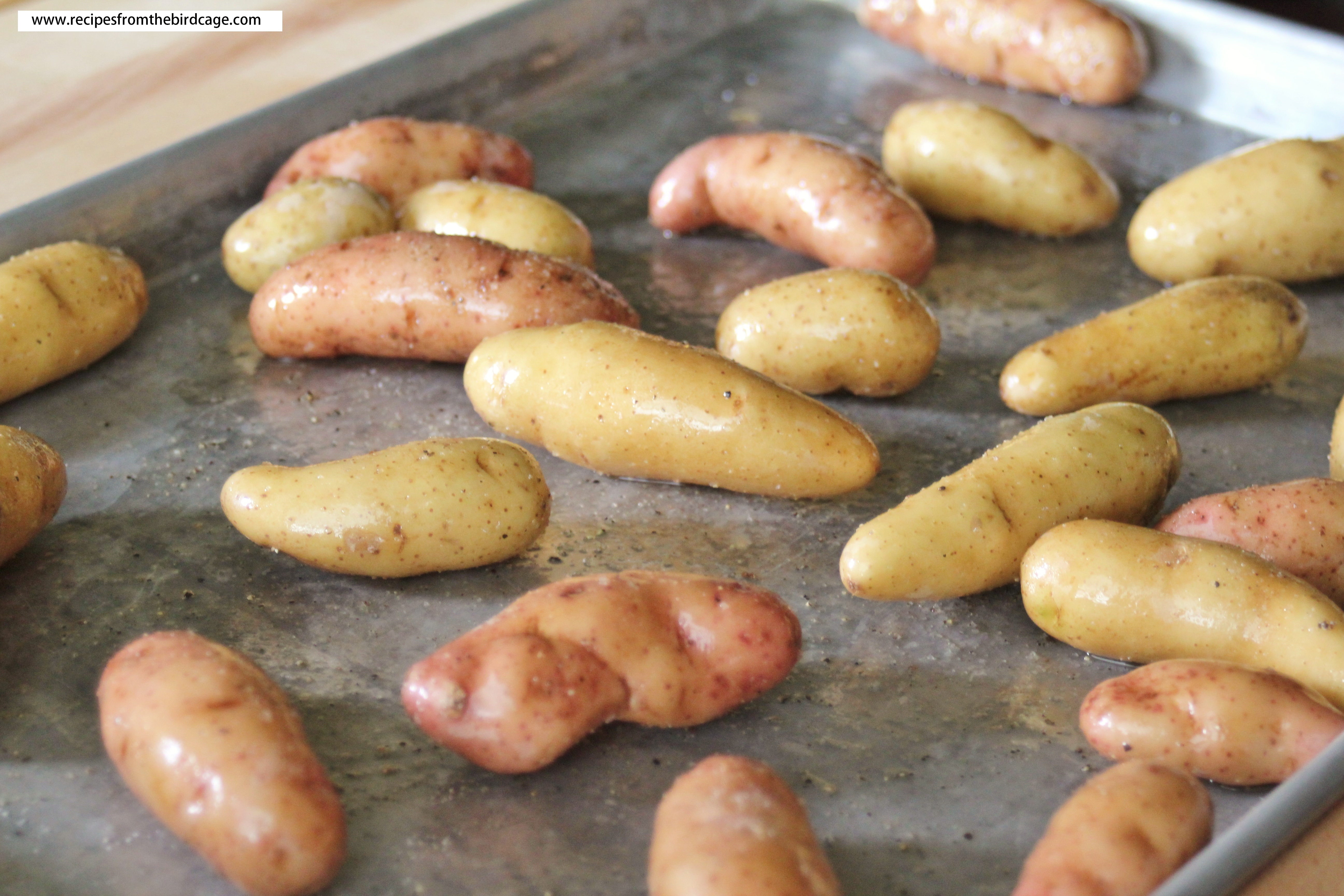 I used fingerling potatoes in this recipe for three reasons: 1 – color, 2 – the lack of peeling and chopping required, and 3 – they were on sale. You may substitute the fingerlings with other thin-skinned tubers – red/new potatoes, Yukon golds, or even purple potatoes (I bet their earthy undertones would be dreamy in this recipe). You will need to cut larger potatoes into fourths.